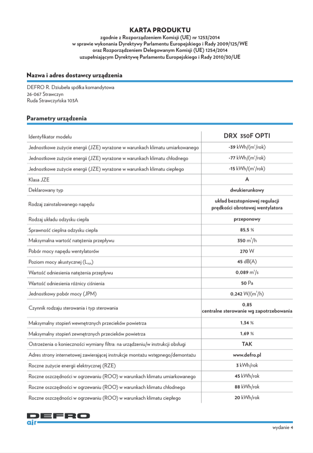 Defro rekuperacja DRX OPTI 350 F L o wydajności 350m3/h