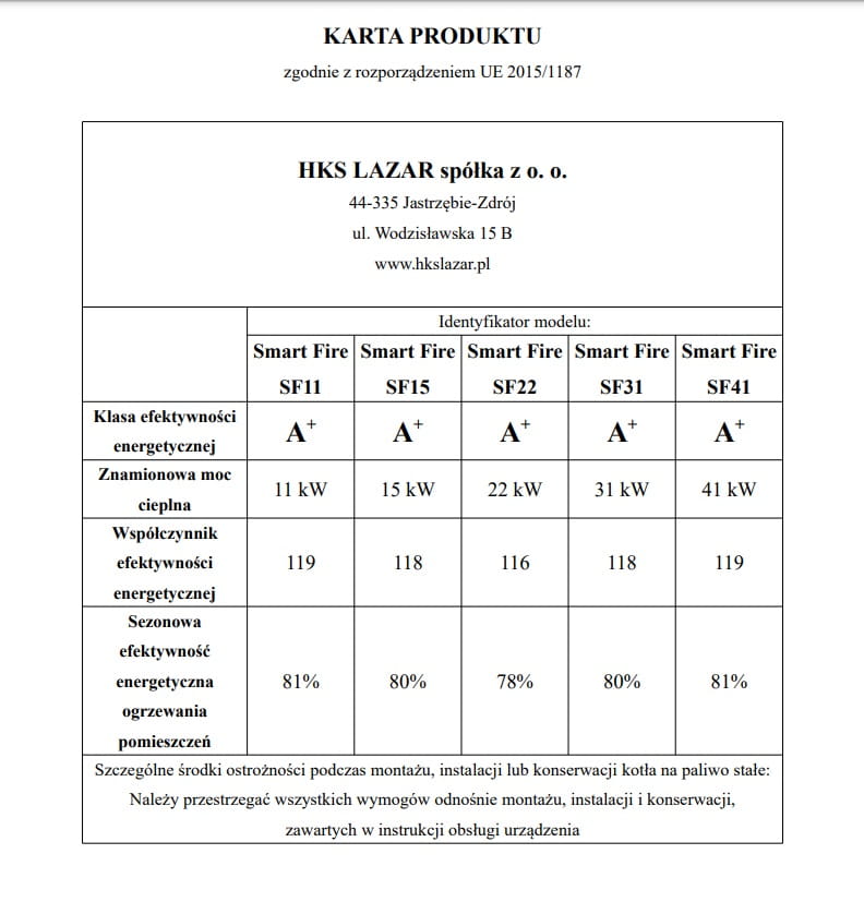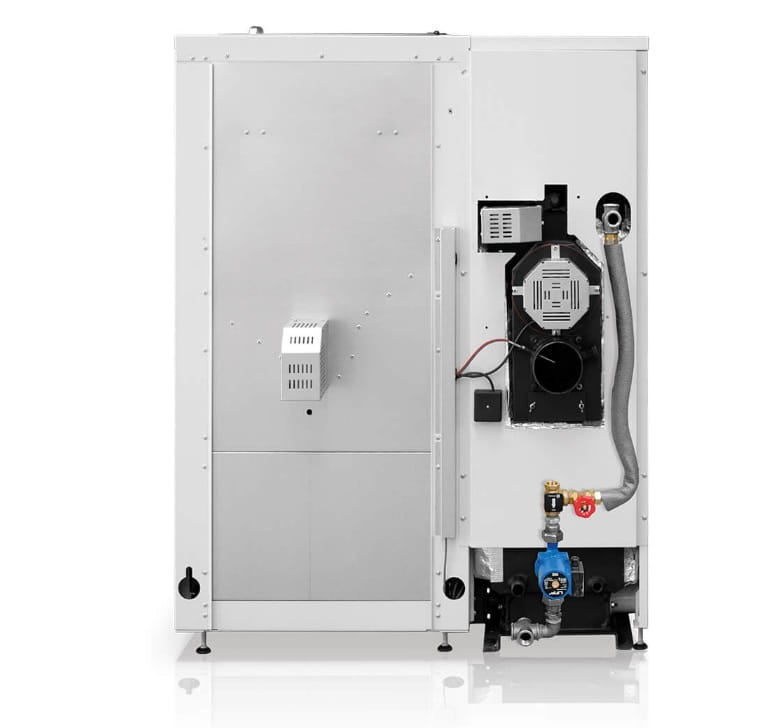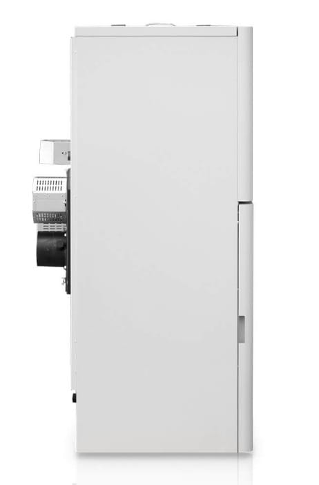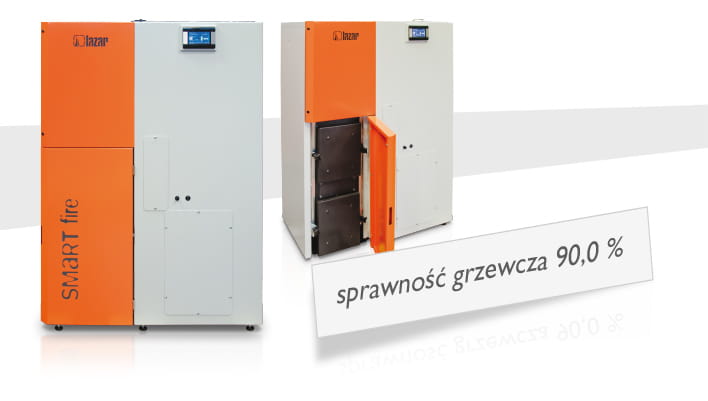 Stalowy kocioł na pelety, z automatycznie czyszczonym palnikiem i zapalarką oraz zestawem hydraulicznym, o sprawności 91,1 % oraz mocach 11, 15, 22, 31 i 41 kW.